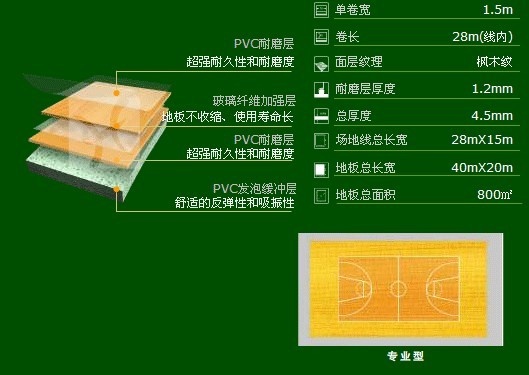 2) 籃球場(chǎng)專(zhuān)用地板100%純PVC耐磨層,厚度達1.5mm,并經(jīng)防老化和緊固技術(shù)處理,耐磨耐壓,使用壽命可達10年。